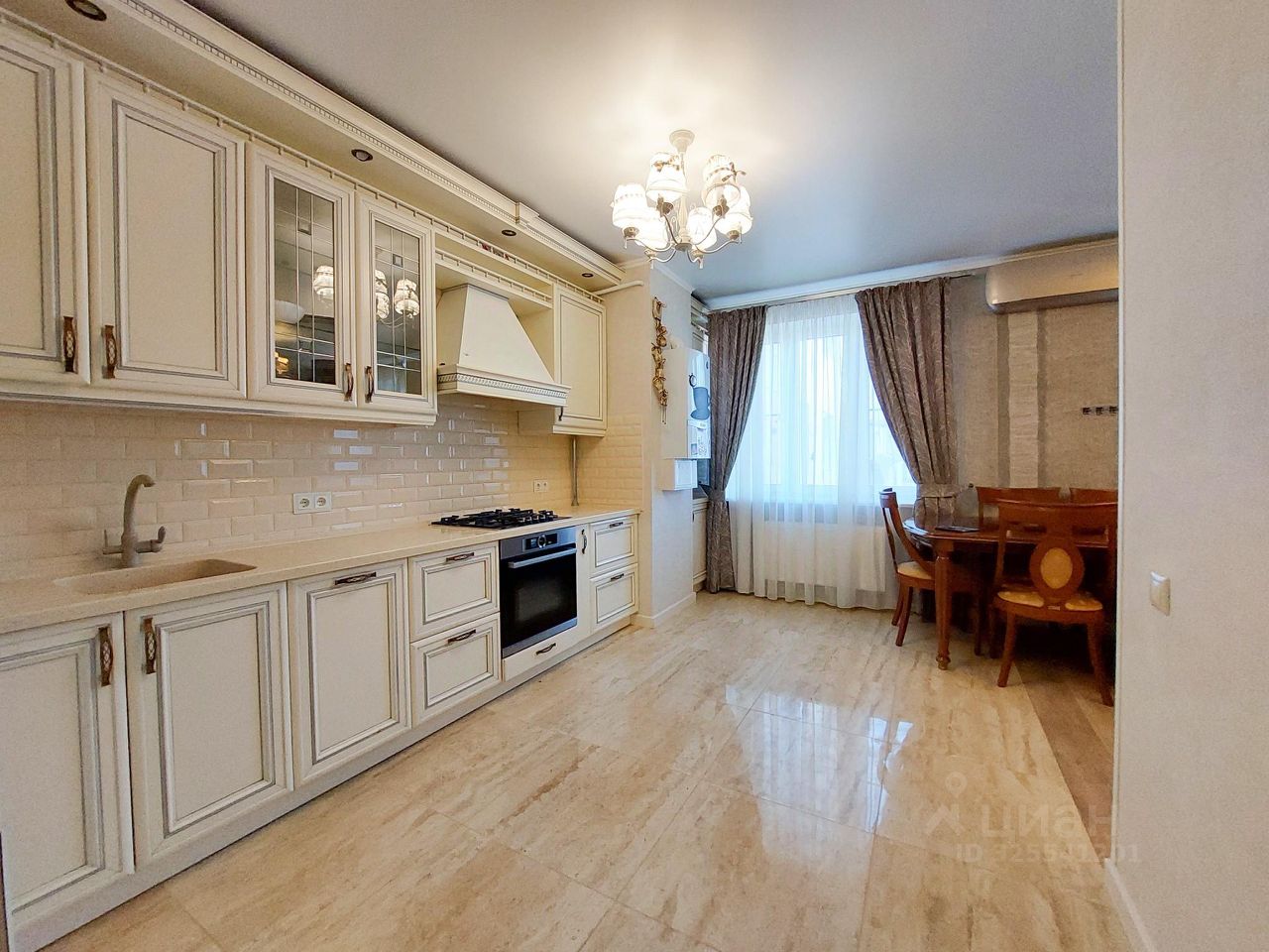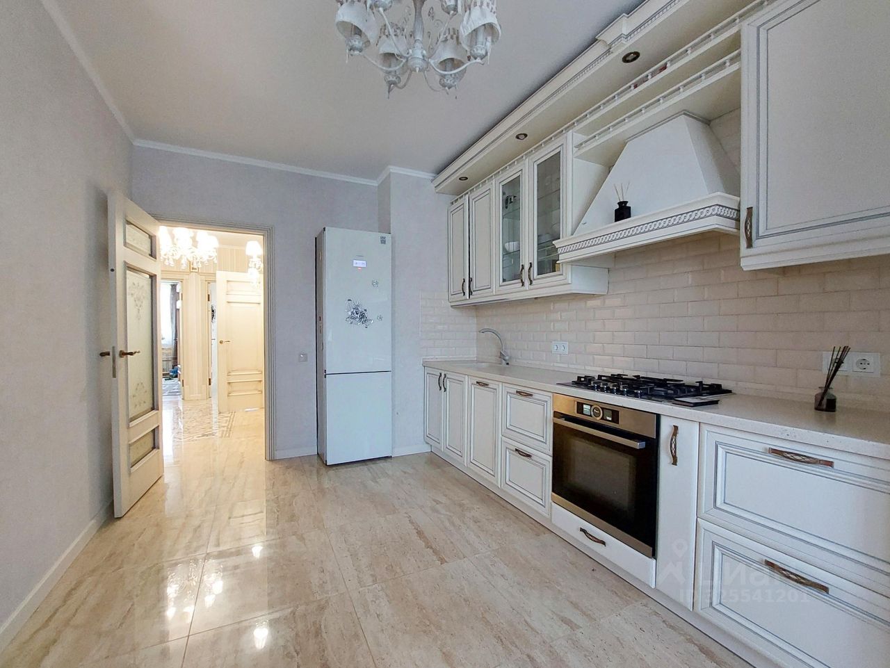 Кухня с гарнитуром оснащен встроенной бытовой техникой: духовой шкаф, посудомоечная машина, холодильник, индукционная варочная панель, вытяжка. В зоне гостинной есть обеленная группа и зана отдыха с большим диваном.